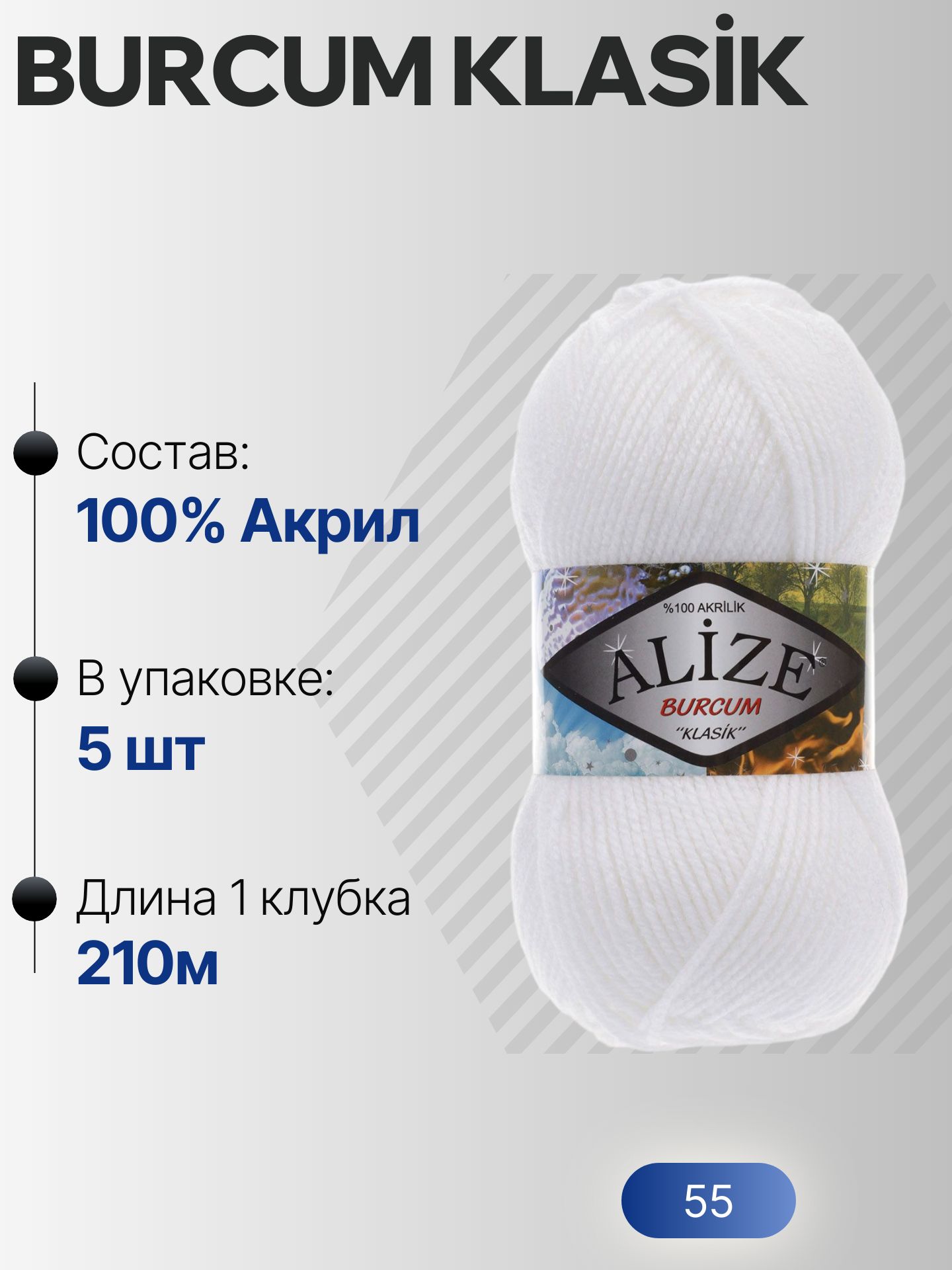 Бурджум классик (Burcum klasik) пряжа Alize 100%акрил 5х100г/210м (55 БЕЛЫЙ) – купить за 899 ₽ | NitkaClub163 Пряжа для вязания в Самаре, Интернет-магазин пряжи и товаров для рукоделия. Самара 116км, 113км, Сухая Самарка, пос. Водников, ЮГ1, ЮГ2