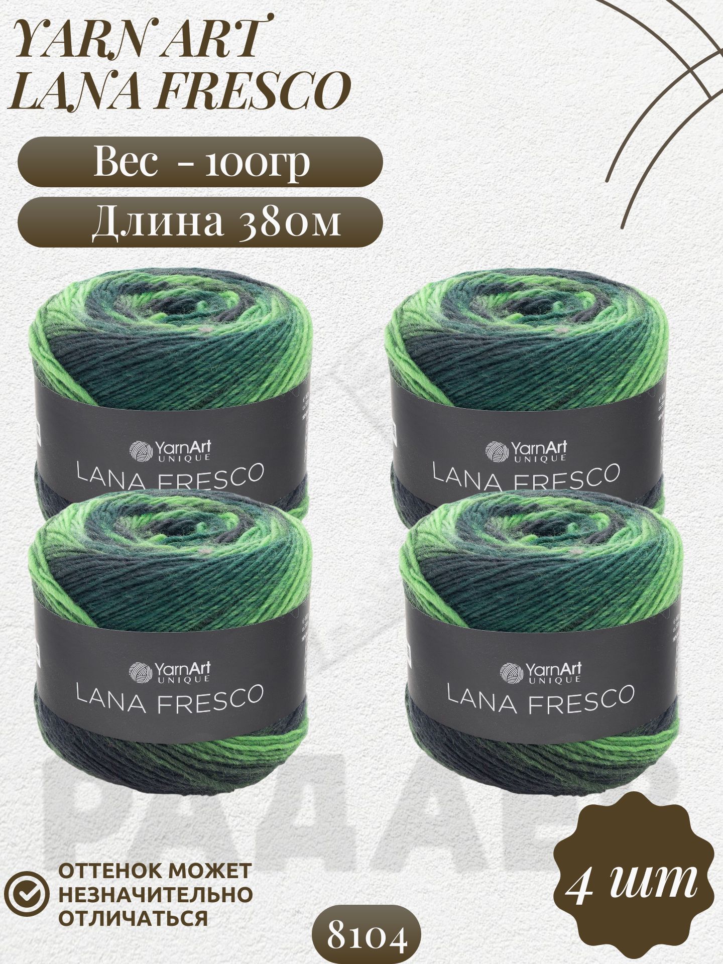 Пряжа Lana Fresco от YarnArt – ваш идеальный спутник для вязания стильных изделий из 100%-ной мягкой шерсти! Объемные мотки по 4x100 г предоставляют 380 м нити, позволяющего создавать яркие акцентные вещи. Удобная толщина нитей делает процесс вязания быстрым и приятным, а прочность и долговечность материала гарантируют, что ваши изделия будут радовать долгие годы. Идеально подходит как новичкам, так и опытным мастерам!