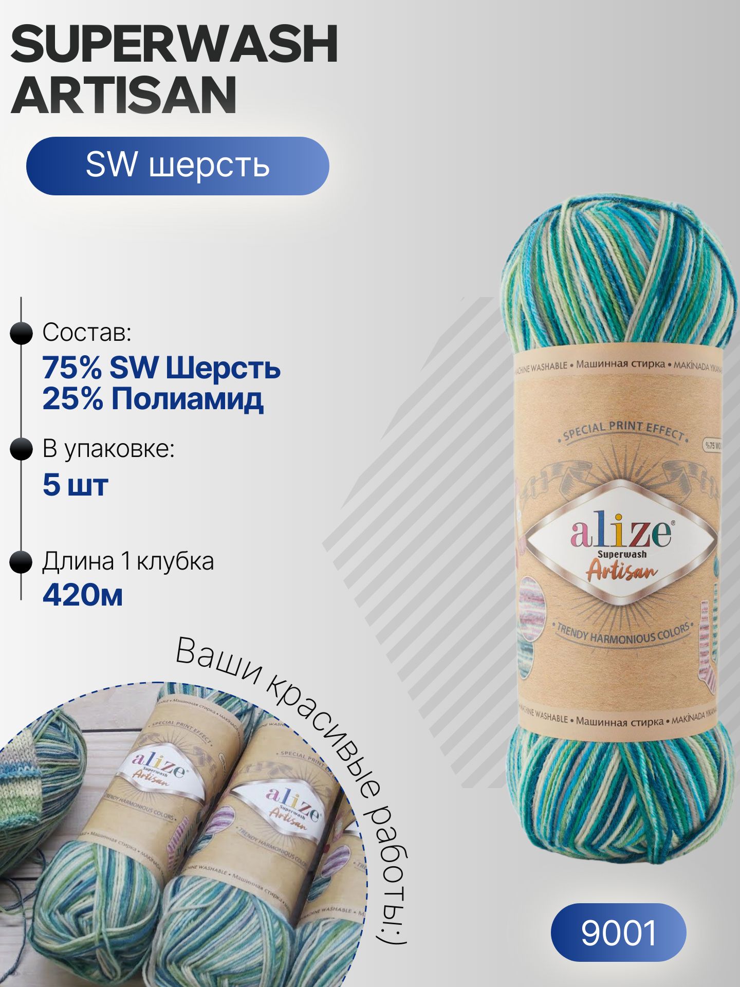 Суперваш артисан (Superwash artisan) пряжа Alize 75%шерсть 25%полиамид 5х100г/420м 9001 экрю-мята-петроль – купить за 1 571 ₽ | NitkaClub163 Пряжа для вязания в Самаре, Интернет-магазин пряжи и товаров для рукоделия. Самара 116км, 113км, Сухая Самарка, пос. Водников, ЮГ1, ЮГ2